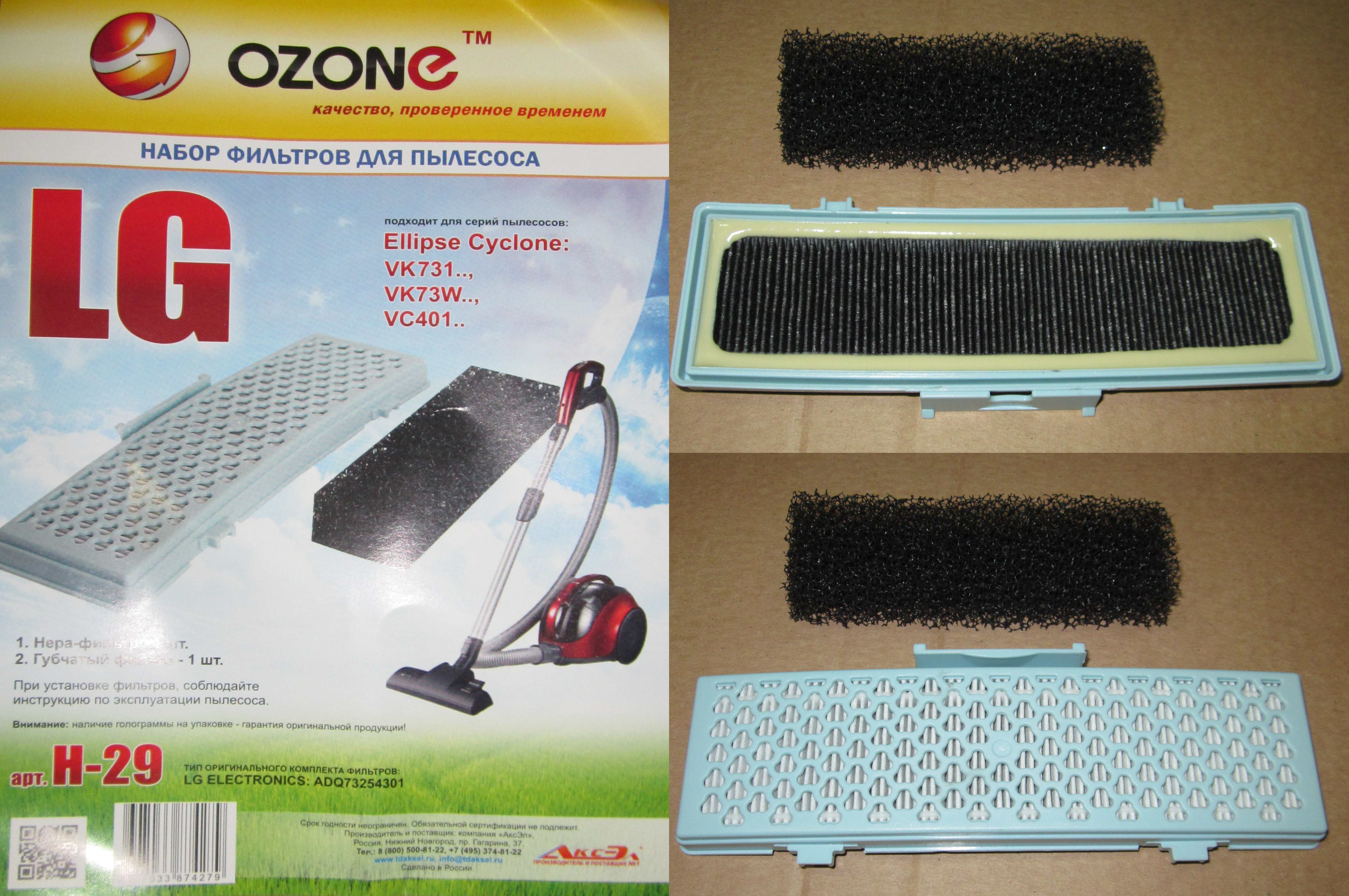 ОписаниеOZONE microne H-29 Набор фильтров: НЕРА-фильтр и губчатый фильтр. Тип оригинального комплекта фильтров LG: ADQ73254301.