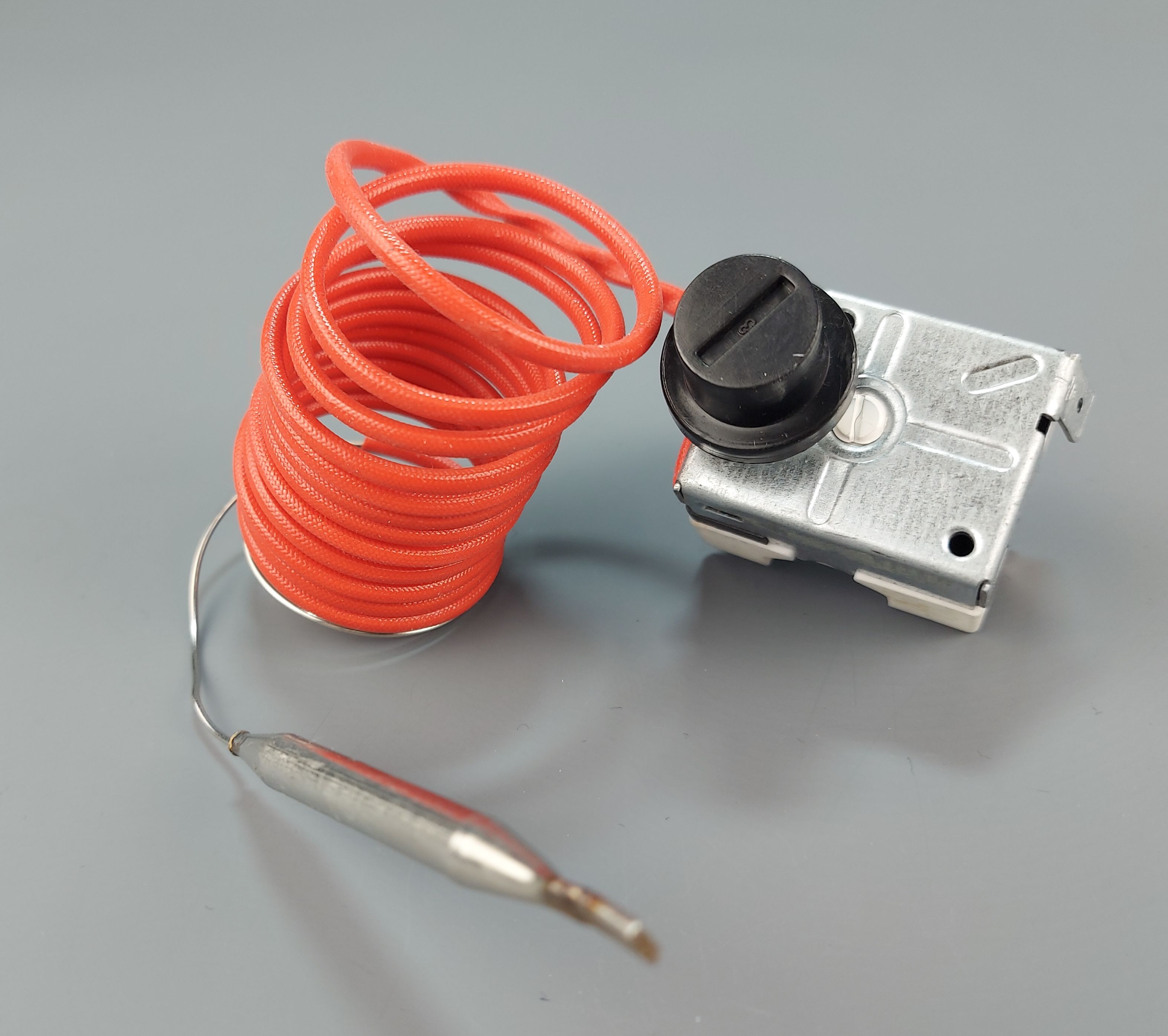 Термостат состоит из регулирующего блока, датчика в виде металлической капсулы (колбы) и капилляра, который соединяет датчик (колбу) с регулирующим блоком термоограничителя.